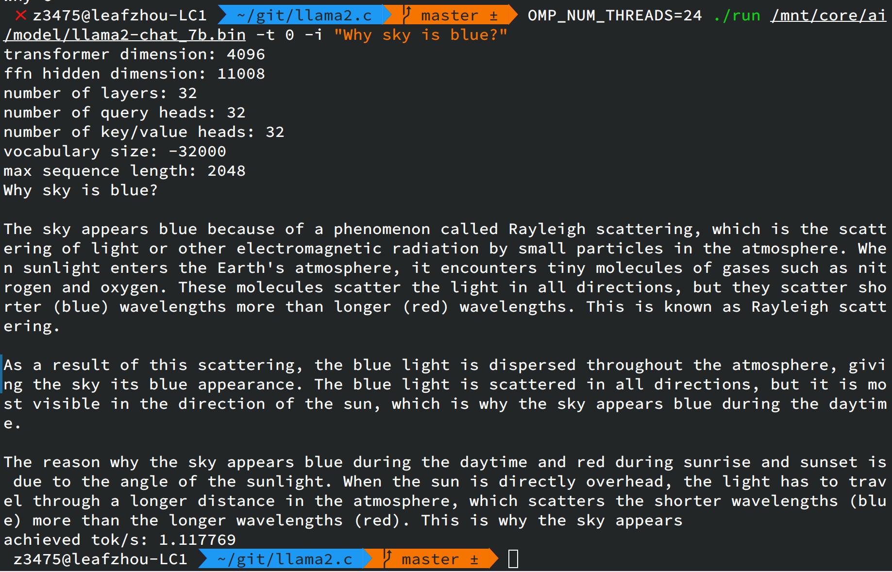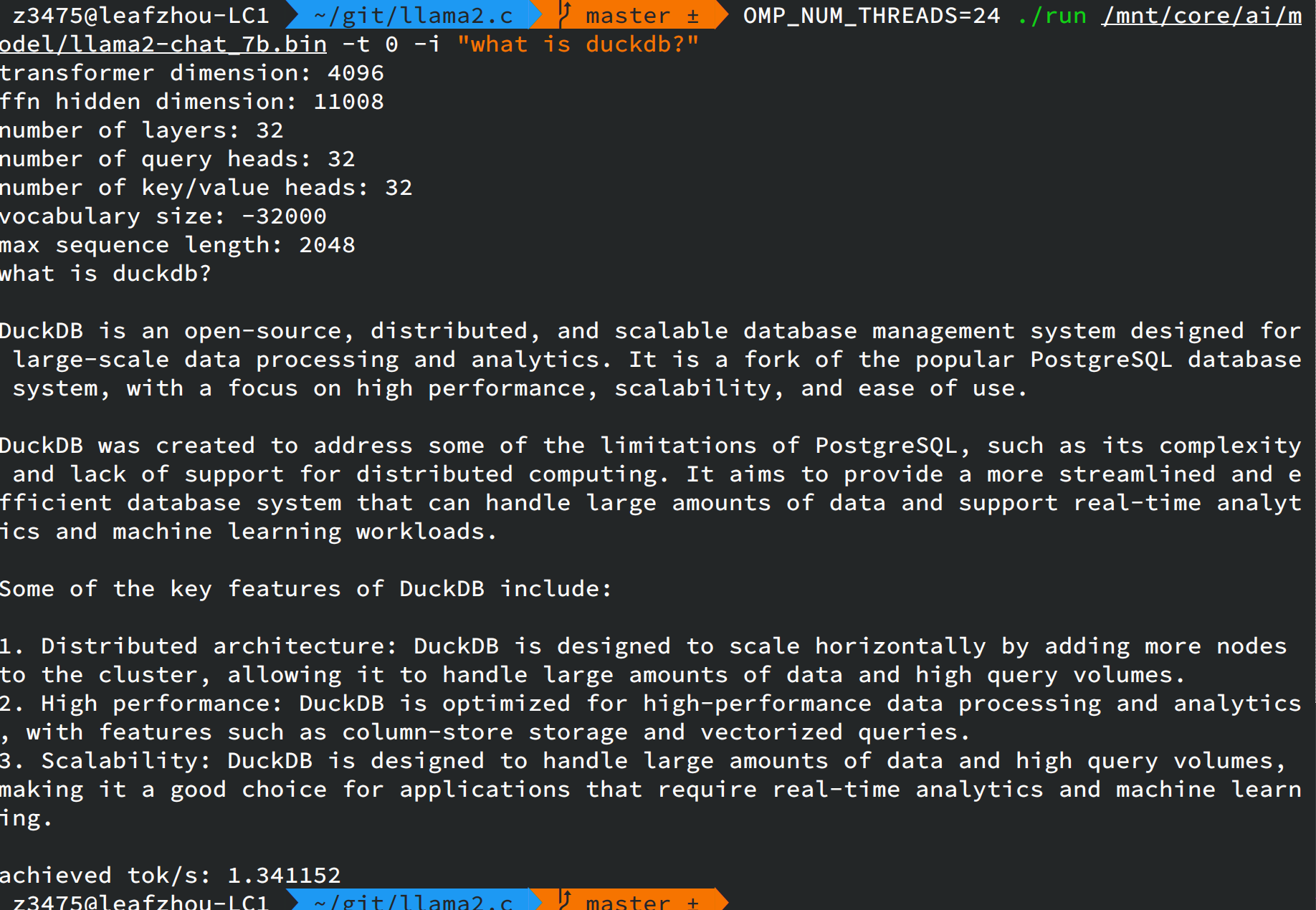 // report achieved tok/s (pos-1 because the timer starts after first iteration) if (pos > 1) { long end = time_in_ms(); fprintf(stderr, "achieved tok/s: %f\n", (pos-1) / (double)(end-start)*1000); }